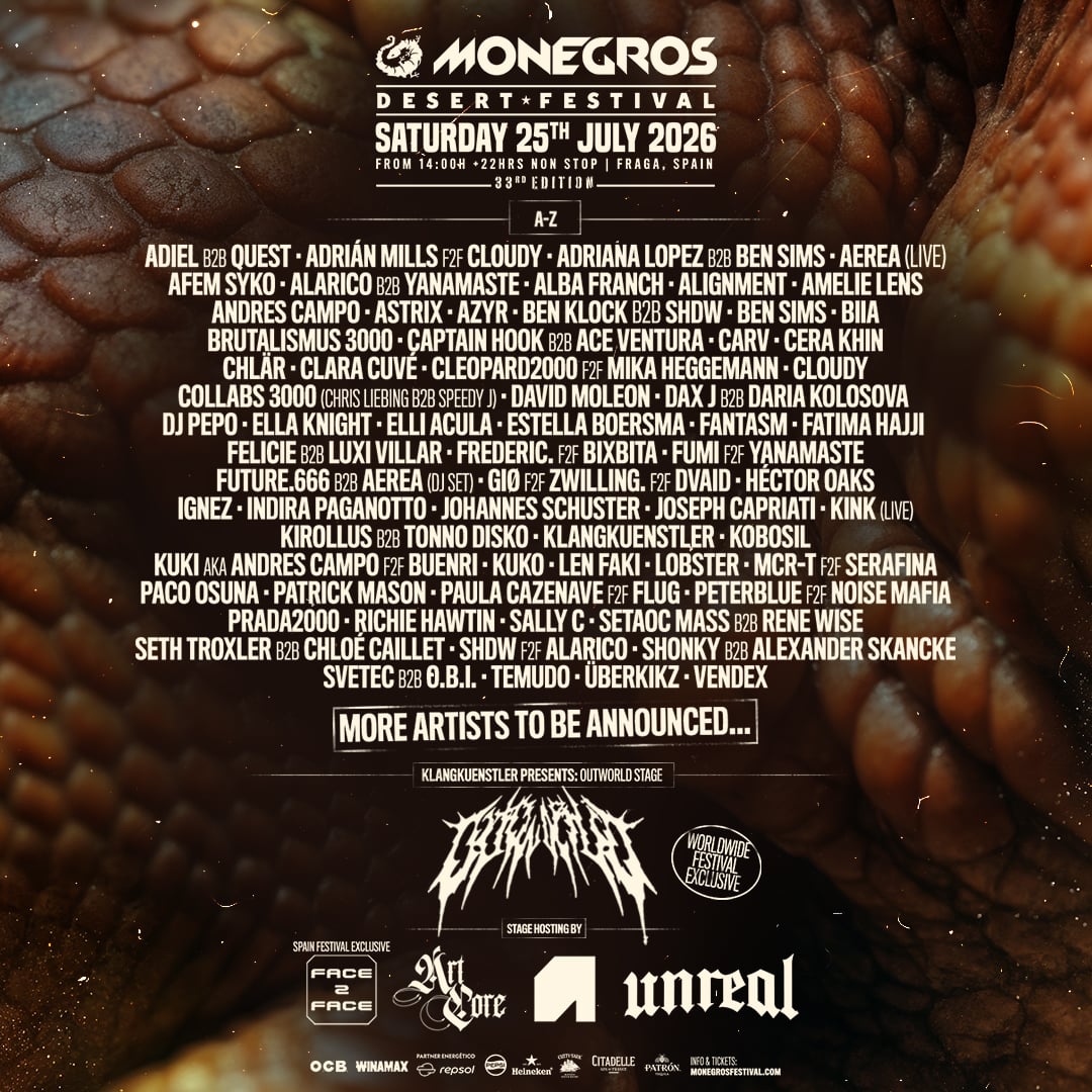 Monegros Desert Festival 2026 regresa el sábado 25 de julio de 2026 al desierto de Aragón, en su ubicación habitual de Fraga (Huesca), con una nueva edición que promete volver a convertir el paisaje más extremo de España en una auténtica ciudad efímera de música electrónica. Con 22 horas non stop, el festival reafirma su estatus como una de... Monegros Desert Festival 2026 regresa el sábado 25 de julio de 2026 al desierto de Aragón, en su ubicación habitual de Fraga (Huesca), con una nueva edición que promete volver a convertir el paisaje más extremo de España en una auténtica ciudad efímera de música electrónica. Con 22 horas non stop, el festival reafirma su estatus como una de las raves más emblemáticas de Europa y uno de los encuentros imprescindibles para los amantes del techno, hard techno, psytechno y electrónica underground.