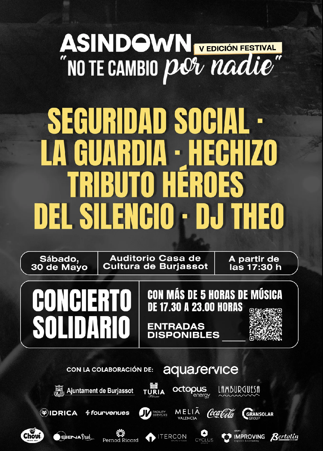 “No te cambio por nadie” celebra su quinta edición consolidándose como un evento solidario donde la música y el compromiso social van de la mano. El festival tendrá lugar el sábado 30 de mayo en el Auditorio de la Casa de Cultura de Burjassot, con más de 5 horas ininterrumpidas de música en directo, desde las 17:30 hasta las 23:00 h.