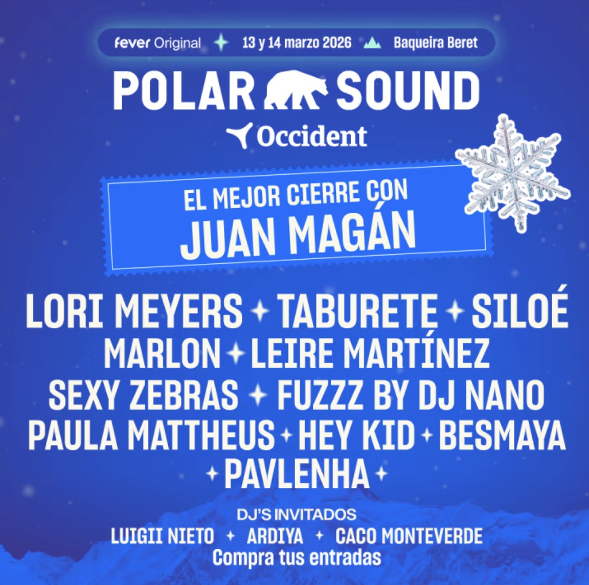 El cartel de Polar Sound 2026 contará con artistas destacados del panorama nacional como Juan Magán, Lori Meyers, Taburete, Siloé, Marlon, Leire Martínez y Sexy Zebras, junto a propuestas como Fuzzz by DJ Nano, Paula Mattheus, Hey Kid y Besmaya, entre otros. Una programación variada que mezcla pop, indie, electrónica y música urbana para crear el mejor ambiente après-ski del invierno.