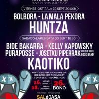 El viernes 29 los conciertos comenzarán a las 20:00 horas, contando como plato fuerte del día con Huntza, un grupo que está dando que hablar este último año y ha triunfado recientemente en el Hatortxu. También se podrán disfrutar las actuaciones de los locales Bolbora y La Mala Pékora. La jornada del sábado dará comienzo a las 16:30, y en ella estarán los ya míticos Kaotiko y Josetxu Piperrak, dos bandas que tienen un largo recorrido en el panorama nacional, y cuyo nombre no falta en ningún festival de rock potente. Subirán al escenario ese mismo día las bandas locales Kelly Kapowsky y Bide Bakarra. Se apuntará a la convocatoria Puraposse, proyecto en el que se encuentran los hermanos Aguayo, con una larga trayectoria desde su primer trabajo allá por el año 96 como Kaos Etiliko.