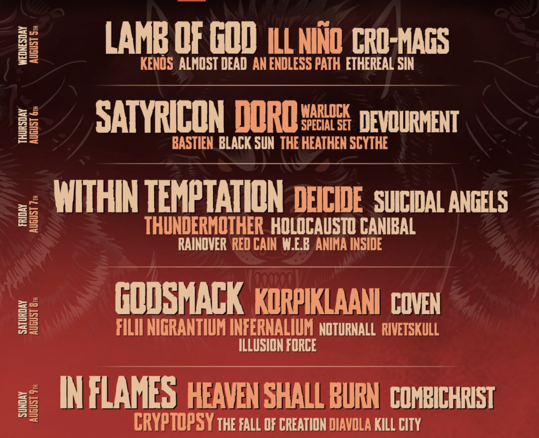 El cartel de Vagos Metal Fest 2026 incluye nombres imprescindibles como Lamb of God, Within Temptation, In Flames, Godsmack, Heaven Shall Burn, Deicide y Combichrist, además de una gran selección de bandas de distintos estilos como thrash, death, black, hardcore y metal alternativo. Esta variedad convierte al festival en una cita perfecta tanto para quienes buscan grandes headliners como para quienes quieren descubrir nuevos proyectos.